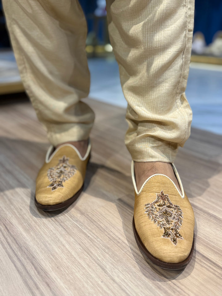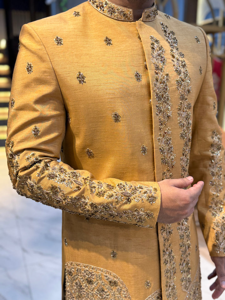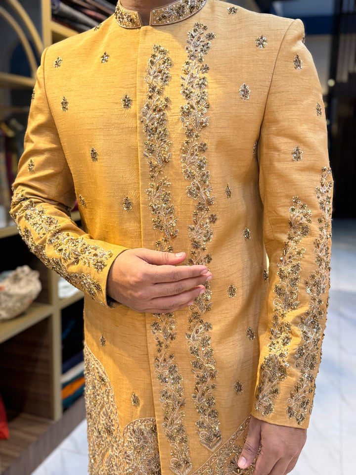 Camel colored sherwani adorned with intricate embroidery, likely crafted from a luxurious fabric. The embroidery style is traditional form of embellishment known as “Zardozi” or “Zari” work. This technique involves the use of metallic threads, beads, and sequins to create elaborate designs.