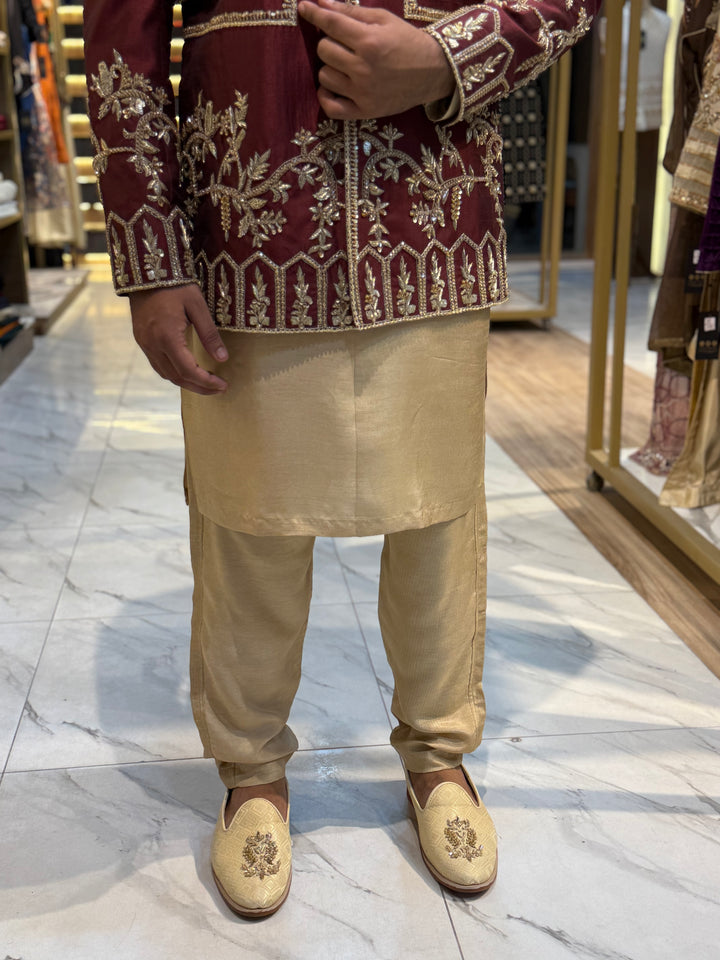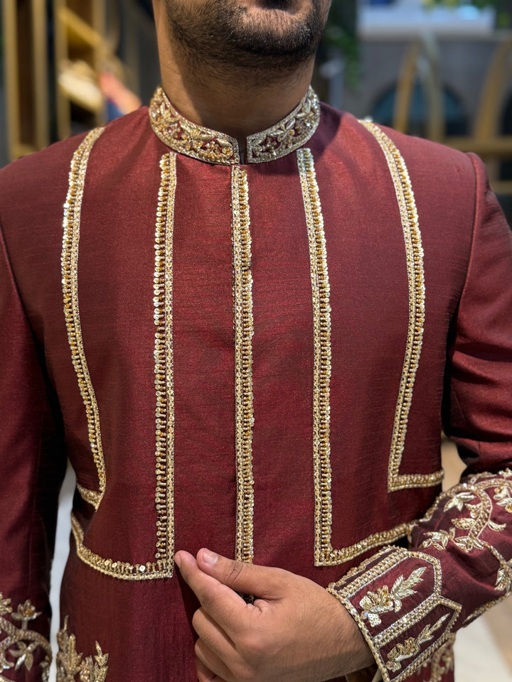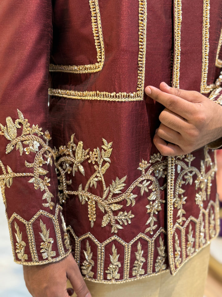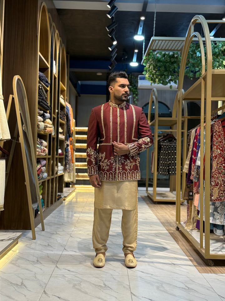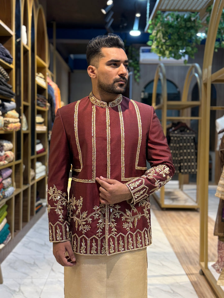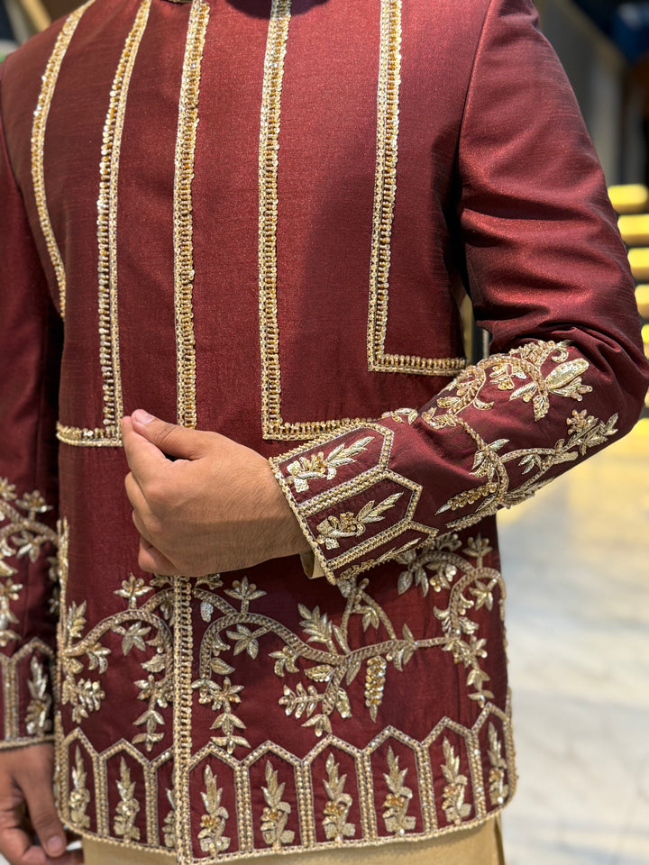 This majestic Prince Coat is a masterpiece of traditional craftsmanship, featuring intricate gold embroidery on a rich maroon fabric. The work pattern showcases a beautiful blend of floral motifs and geometric designs, adding a touch of sophistication and grandeur. Perfect for formal occasions, weddings, or special events, this luxurious Prince Coat exudes elegance and refinement.