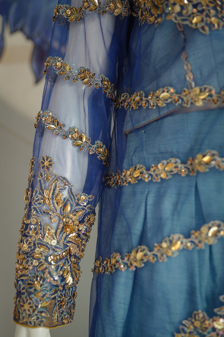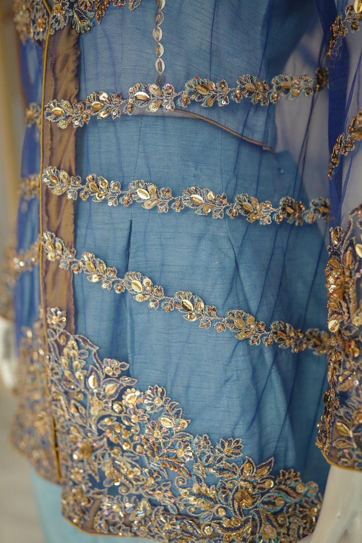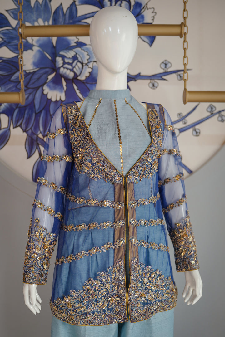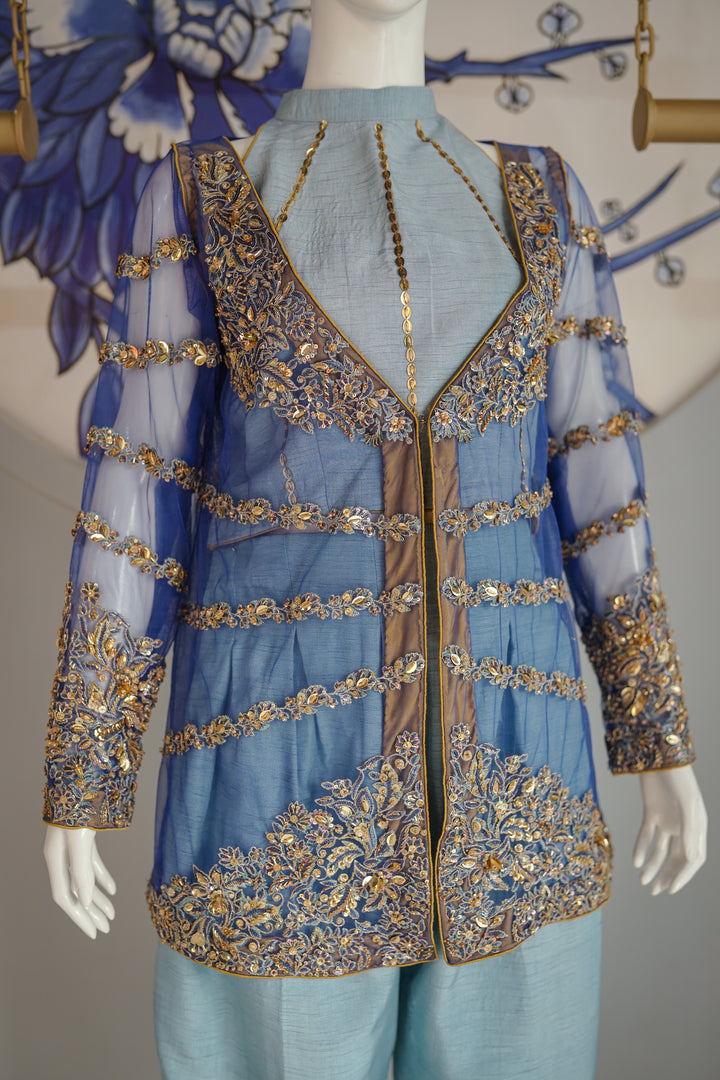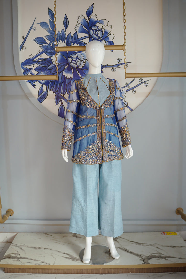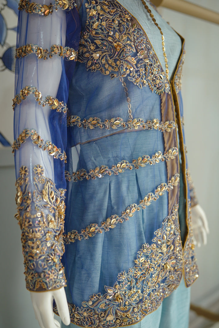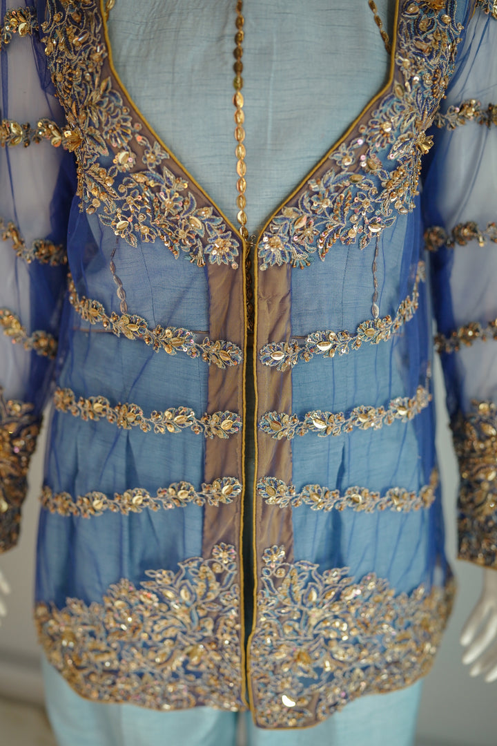 A refreshing take on contemporary elegance — Aasmani Bahaar is a two-piece statement outfit in hues of sky blue and bronze, blending sheer sophistication with traditional charm. The jacket-style top is crafted from organza, delicately embroidered with floral vines, zari work, and shimmering sequins arranged in horizontal bands across the sleeves and bodice. Paired with wide-legged raw silk pants in a soft powder blue, the look is light, graceful, and undeniably regal. Ideal for mehndi receptions, high teas, or contemporary festive gatherings.