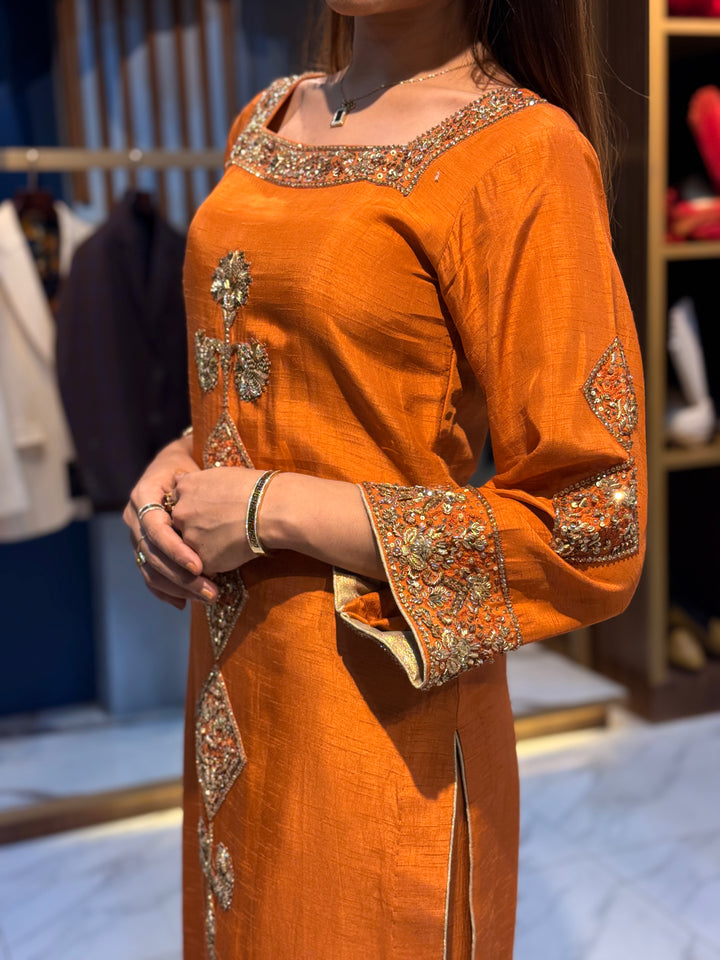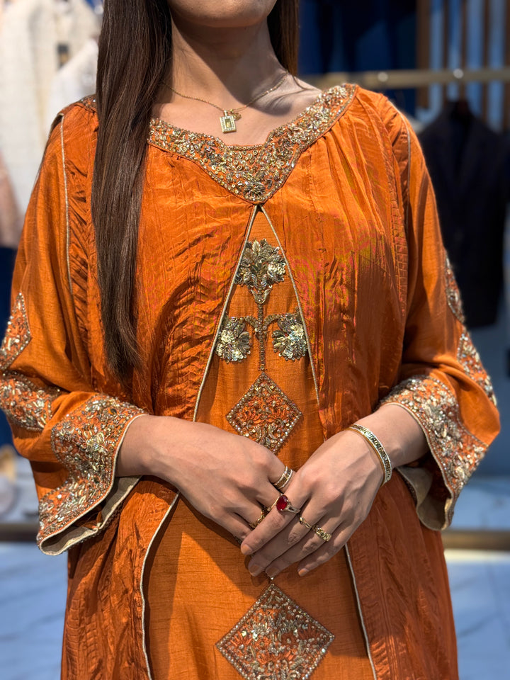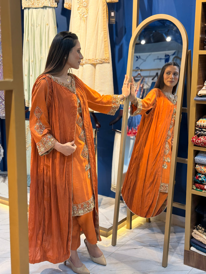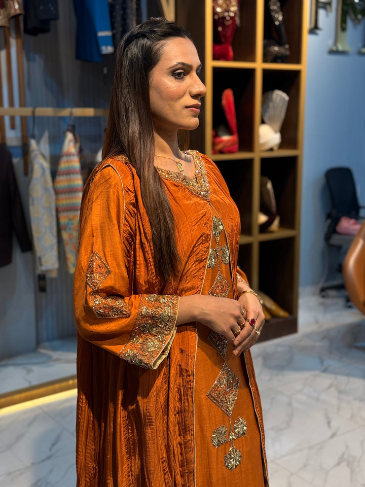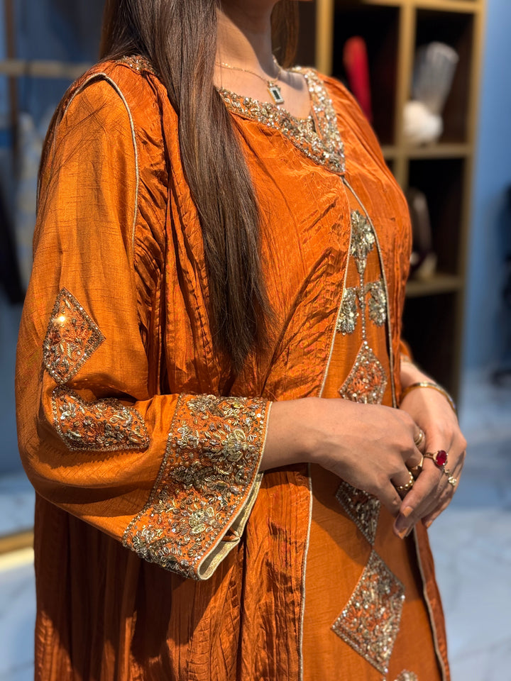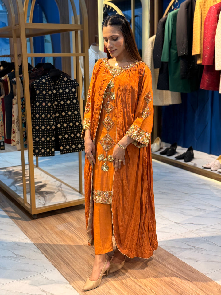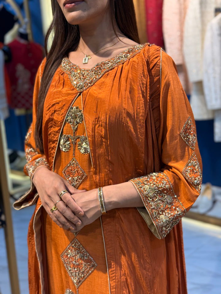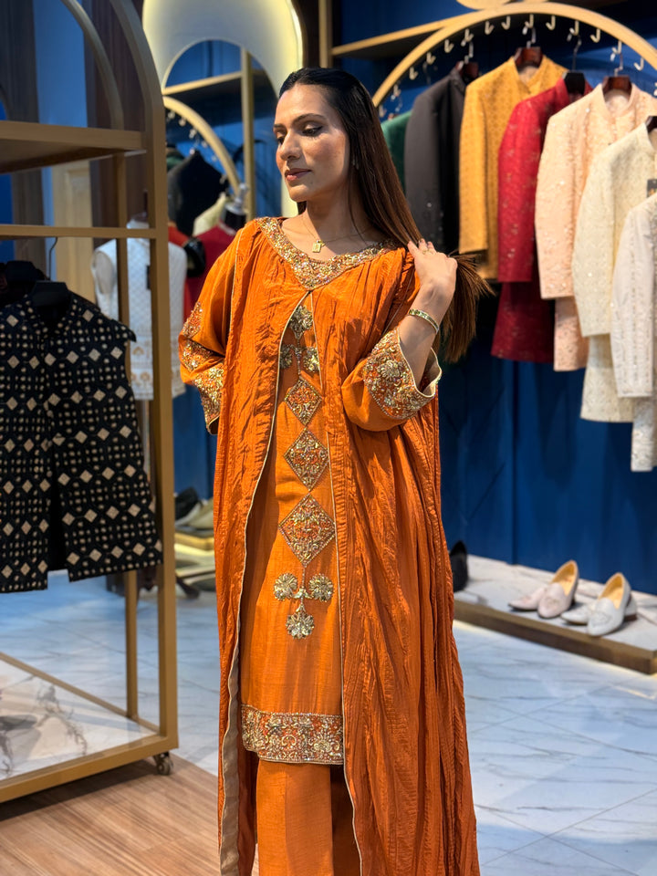 Bold, regal, and rooted in heritage — Surmai Soz is a statement ensemble in a striking burnt rust hue that commands attention. The front-open, cape-style overlay adds dramatic flair, while intricate gota and zardozi embroidery in antique silver and gold elevate the overall design. The geometric diamond motifs on the shirt and sleeves bring a traditional structure to the flowy silhouette. Tailored straight pants balance the layered look, making it a showstopper for festive events, mehndis, or wedding guests who love a fusion of drama and tradition.