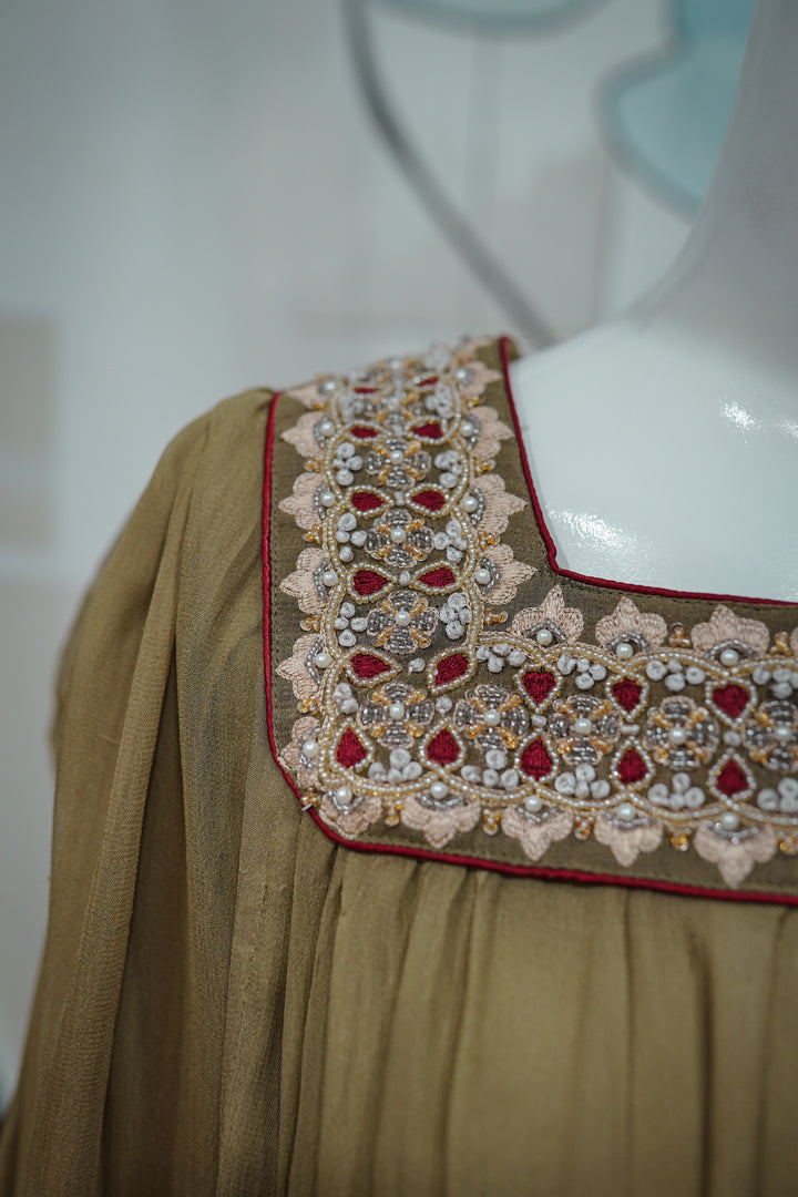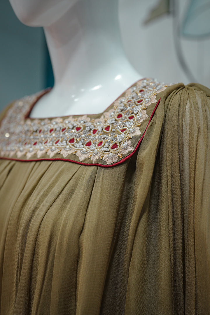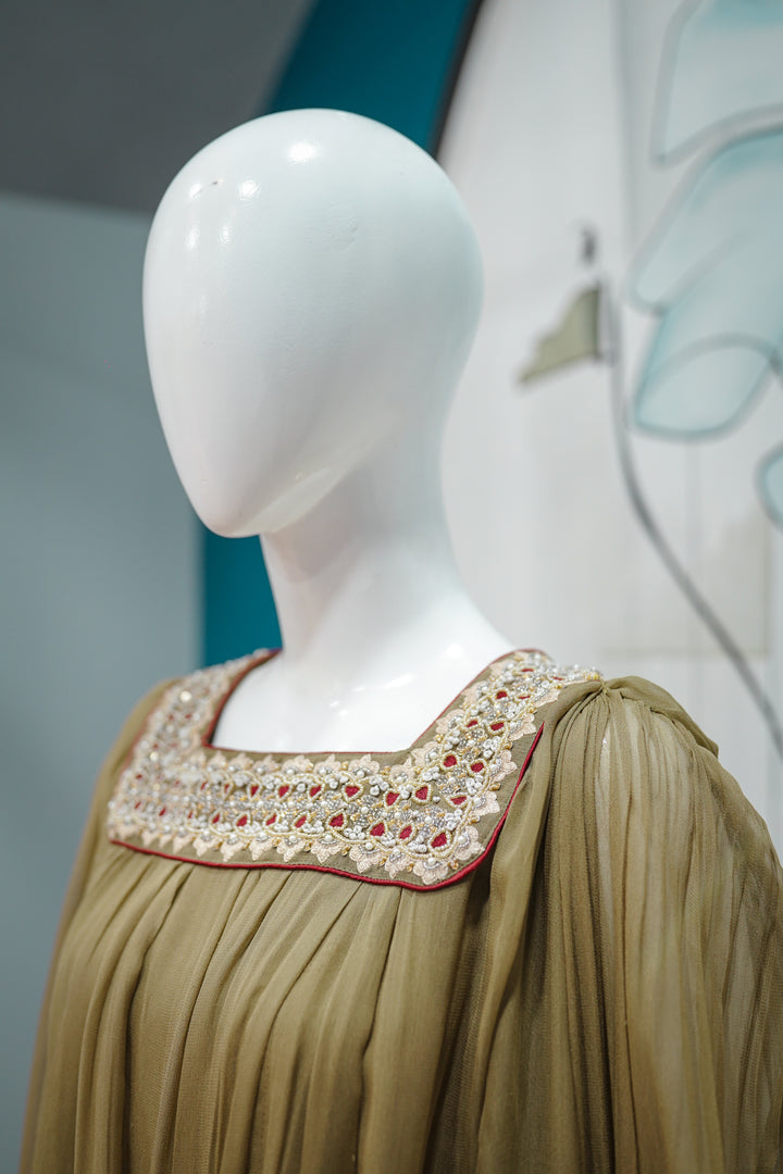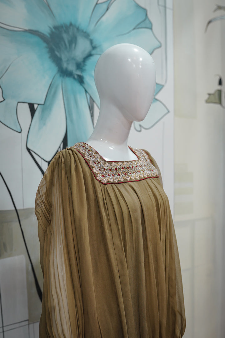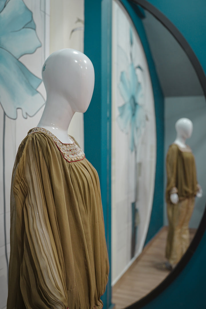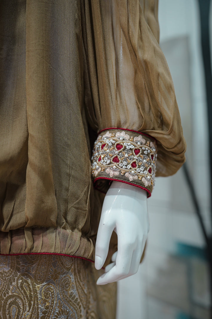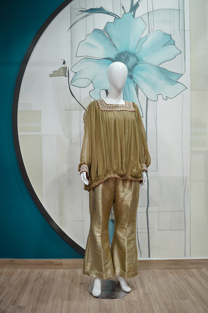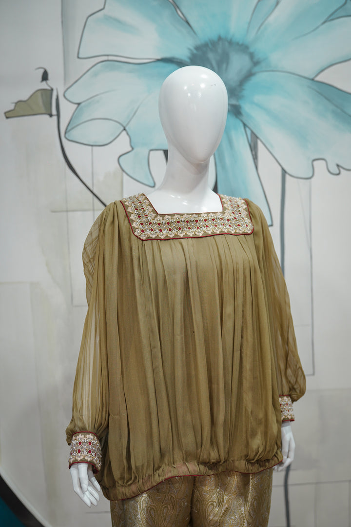 Zareen Aura is where vintage charm meets modern silhouette — a bold fusion piece for the contemporary festive wardrobe. The olive-toned pleated top features a relaxed, balloon-style cut with a square neckline intricately embellished with multicolor beadwork and mirror details. The voluminous sleeves are cuffed with embroidered panels, adding a regal finish. Paired with golden brocade culottes, detailed with subtle paisley motifs, this ensemble offers movement, drama, and luxury — perfect for fashion-forward events, mehndis, or evening affairs with a twist.