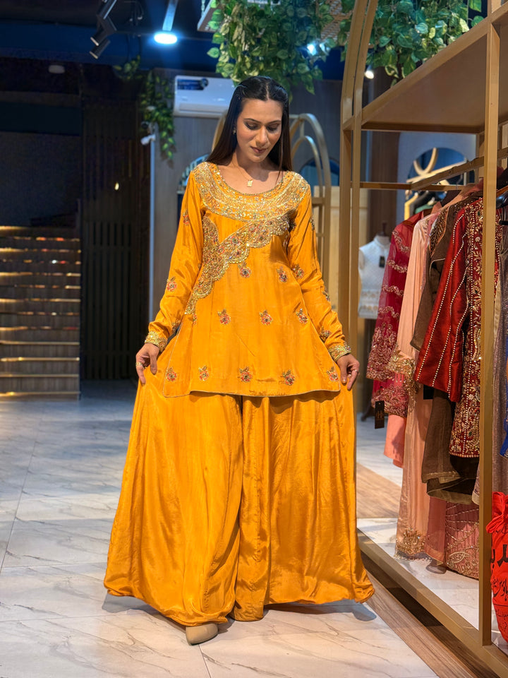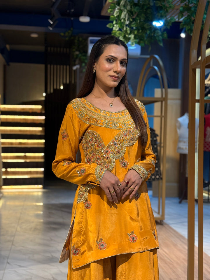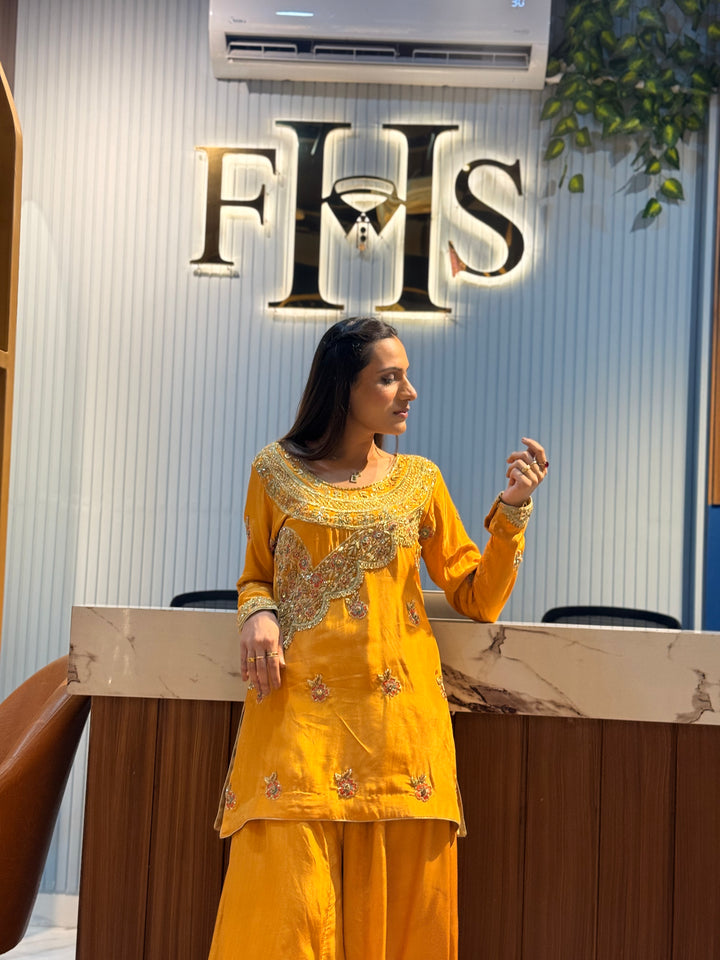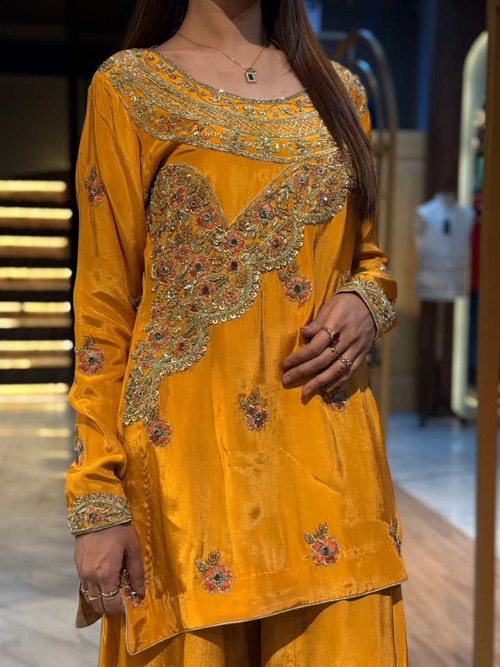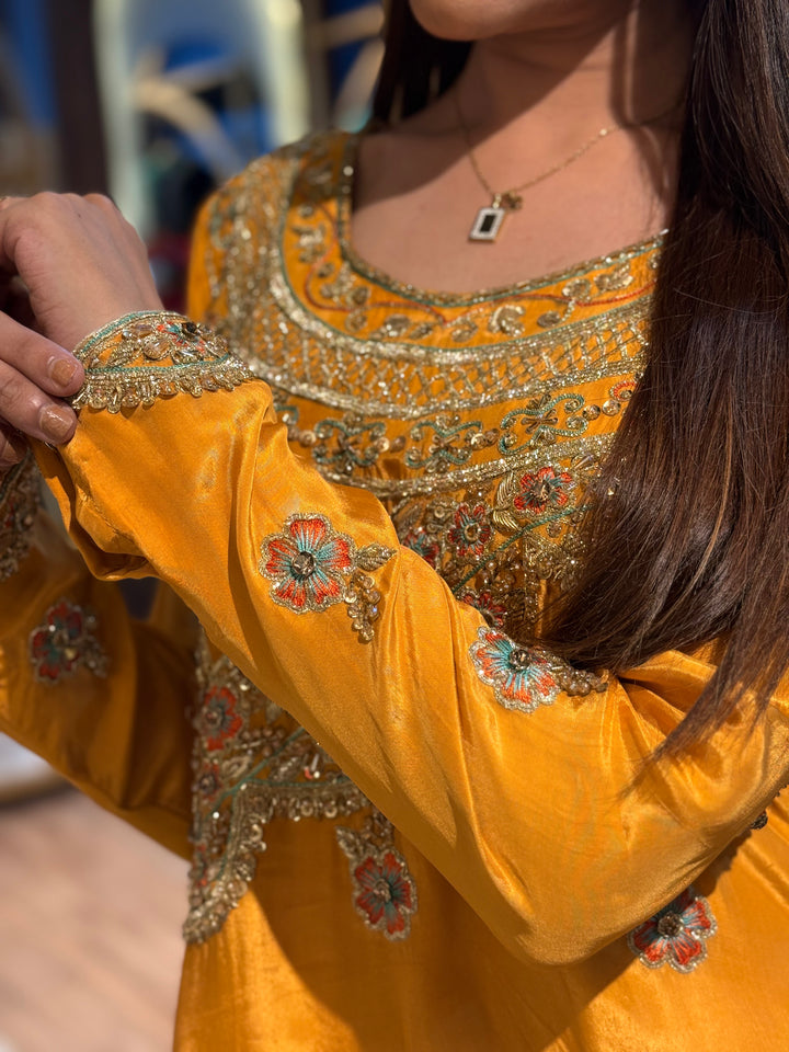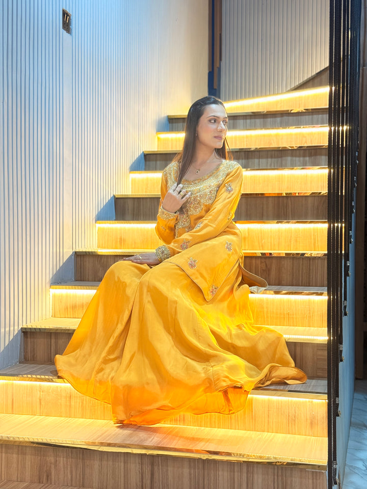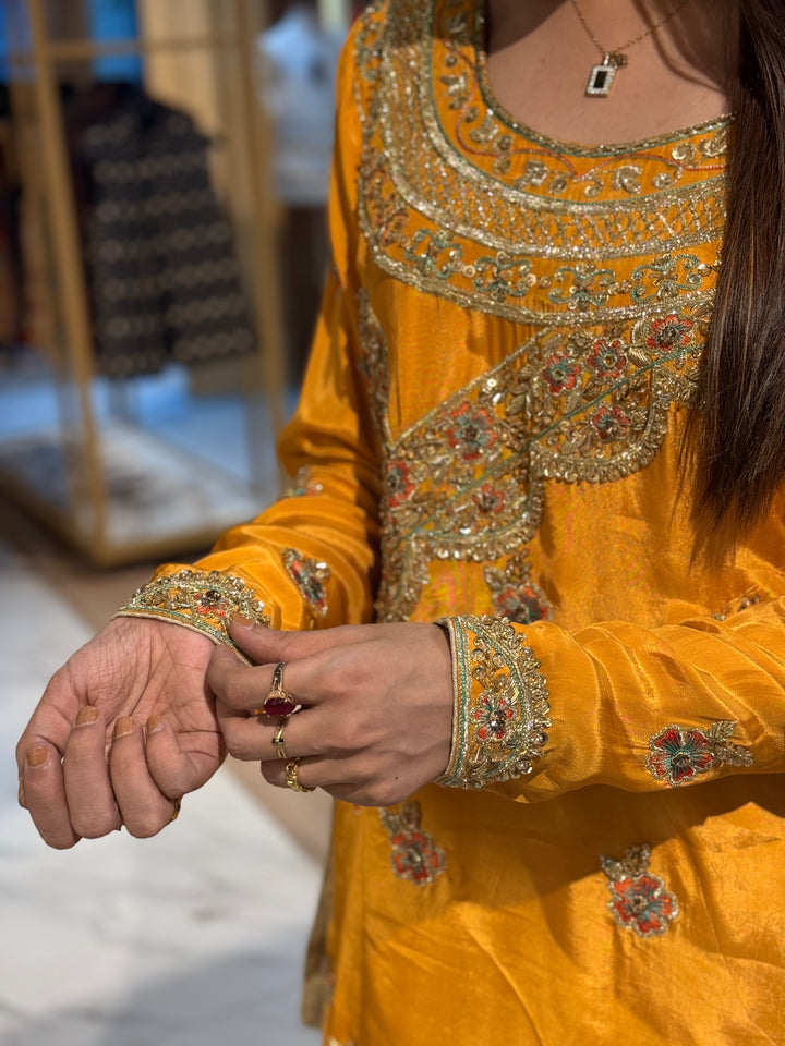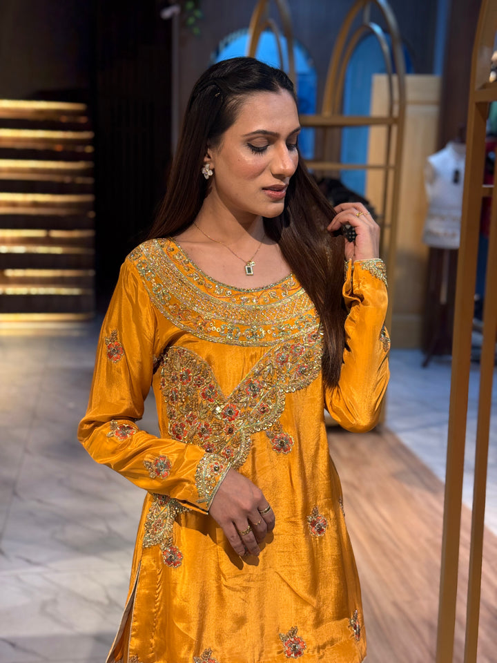 Step into timeless elegance with Zarnish, a radiant mustard-gold ensemble that’s perfect for festive occasions and cultural celebrations. The kameez is adorned with intricate hand embellishments, featuring delicate threadwork and shimmering sequins, cascading in an elegant asymmetric motif across the bodice. Small floral bootis are scattered across the shirt, creating a balance of grace and grandeur. Paired with a voluminous gharara-style bottom, the silhouette flows effortlessly — offering both tradition and modern sophistication in one stunning outfit.