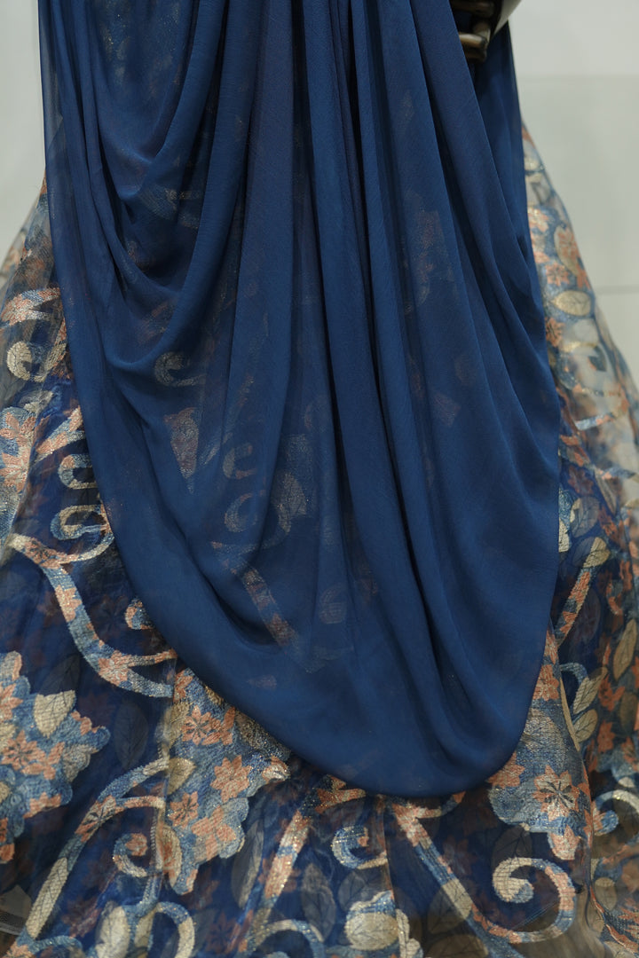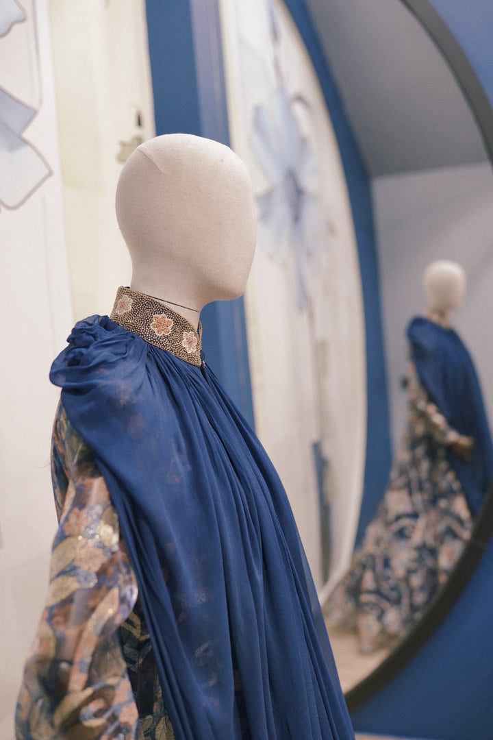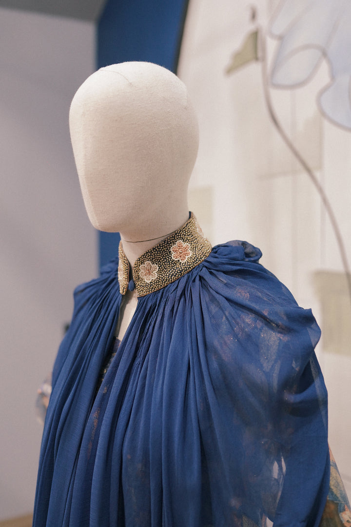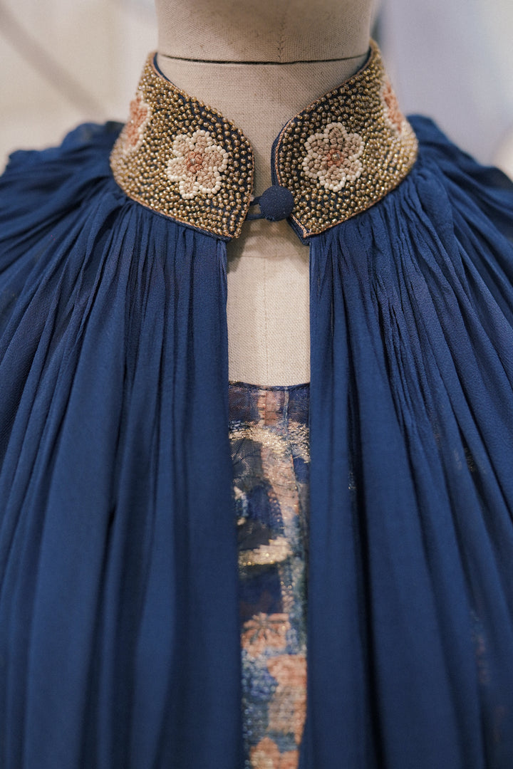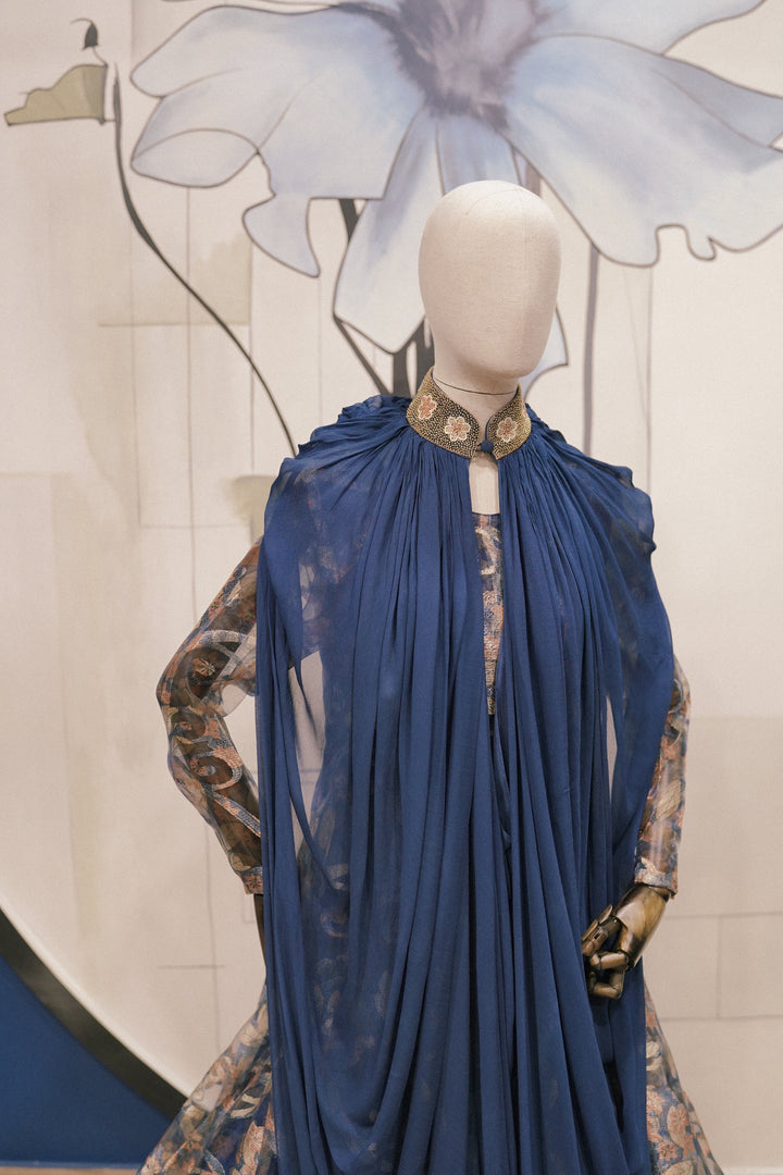 A piece that defines royal drama — Neel Rani is an artful fusion of structured elegance and regal flair. Featuring a flowing navy-blue cape draped over a printed silk base, this ensemble is crafted for those who command attention. The cape gathers gracefully at the collar, finished with intricate floral embroidery and subtle beadwork, creating a majestic neckline that stands out. The underlying dress features muted traditional patterns in rust, copper, and navy hues, adding layers of cultural richness beneath the modern silhouette.