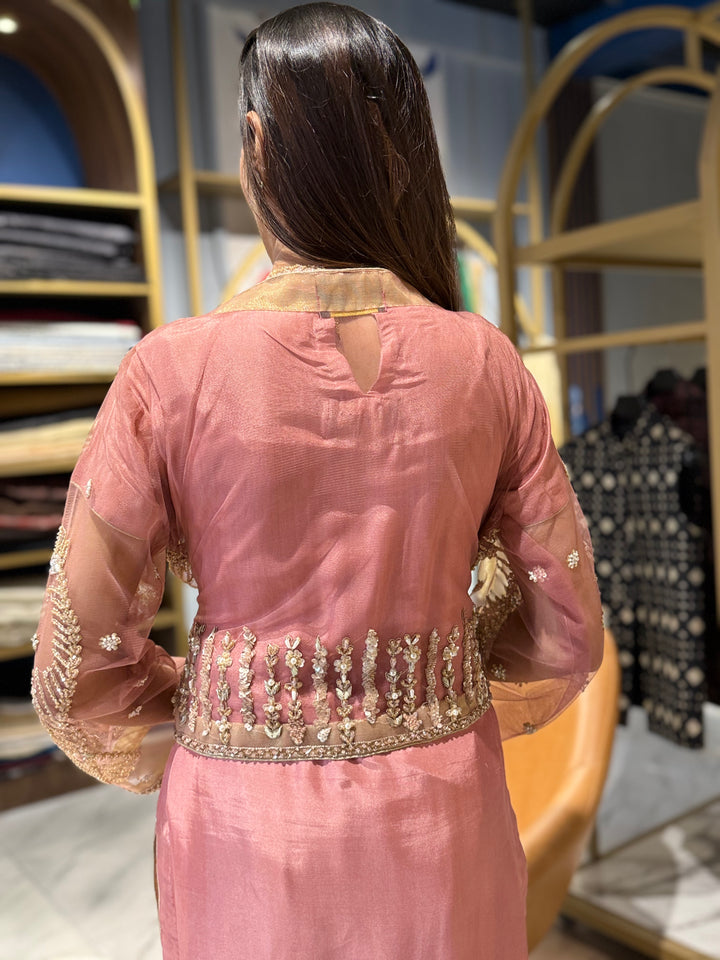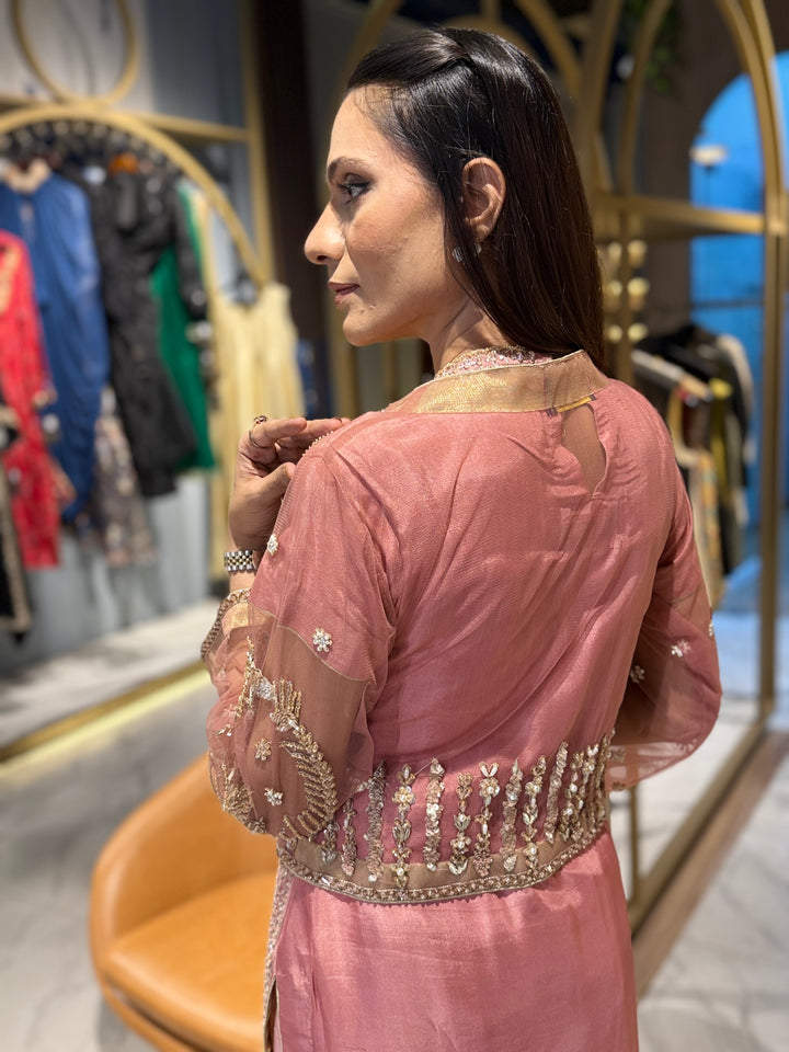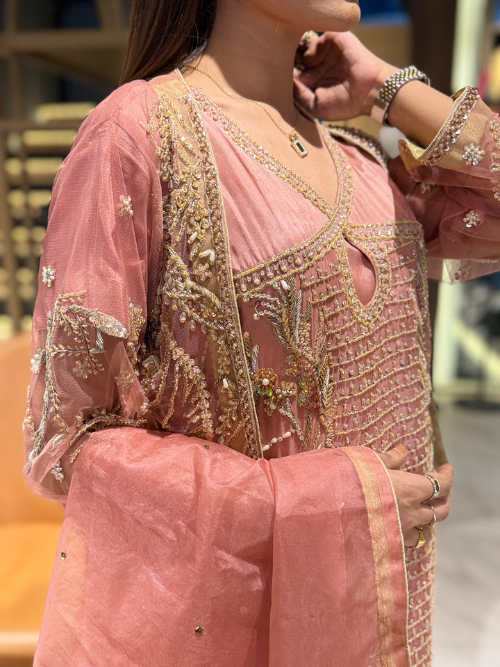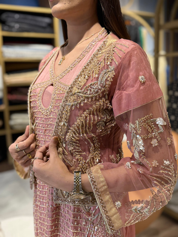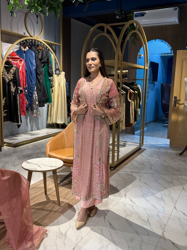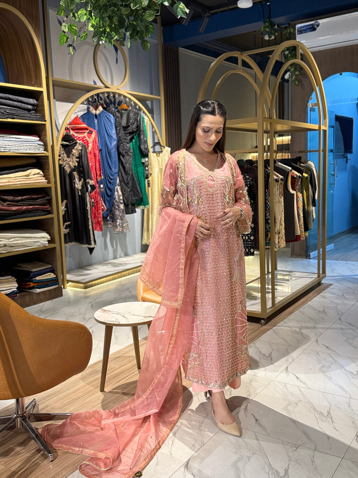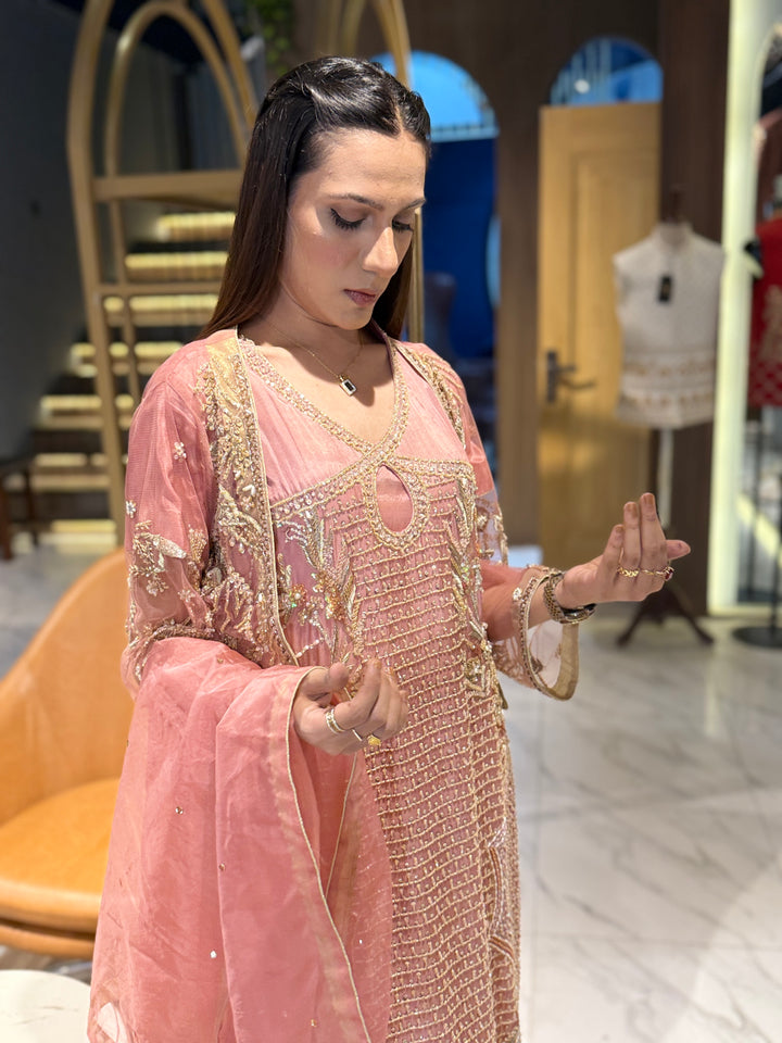 Soft, romantic, and undeniably elegant — Gulaabi Mehkaar is a pastel dream brought to life. This blush pink ensemble is heavily adorned with intricate silver and champagne-toned embroidery, forming a rhythmic grid across the front. A keyhole neckline adds a modern flair, while the sleeves and dupatta feature delicate floral vines and detailed motifs that speak volumes of craftsmanship. The lightweight net dupatta drapes effortlessly, completing a look that’s made for intimate festivities, engagement soirées, and formal events with a graceful touch.