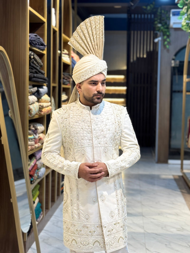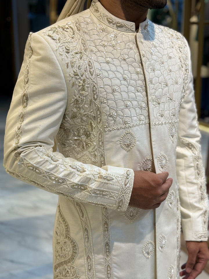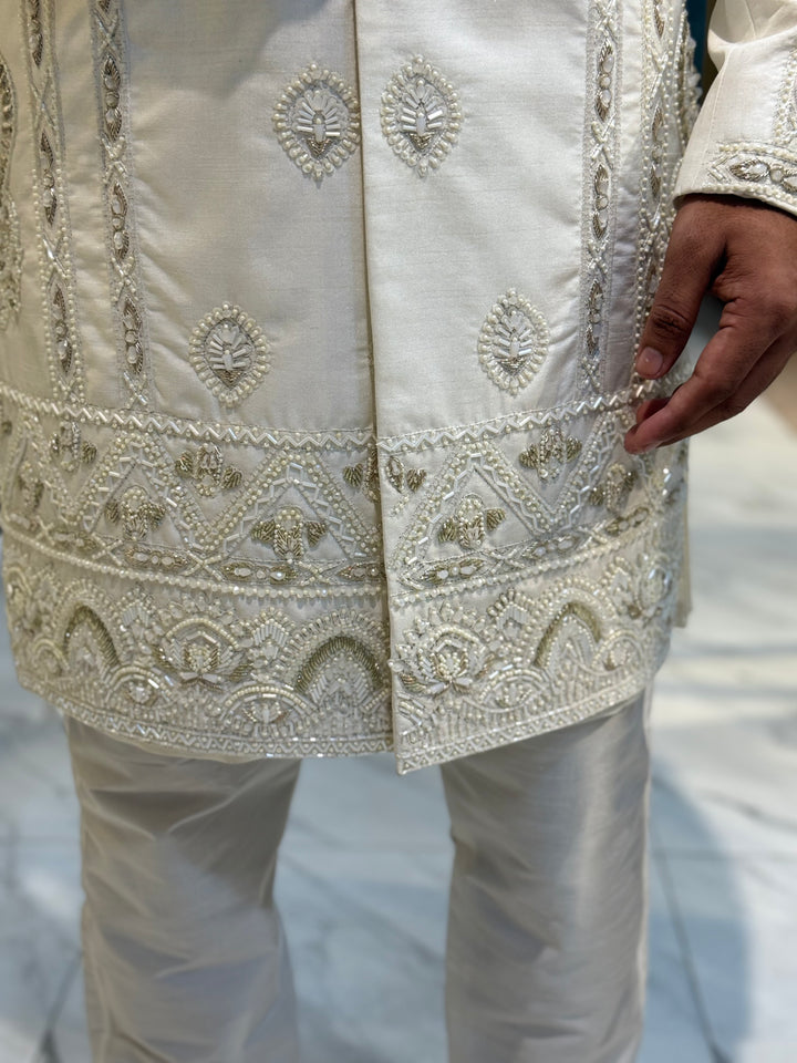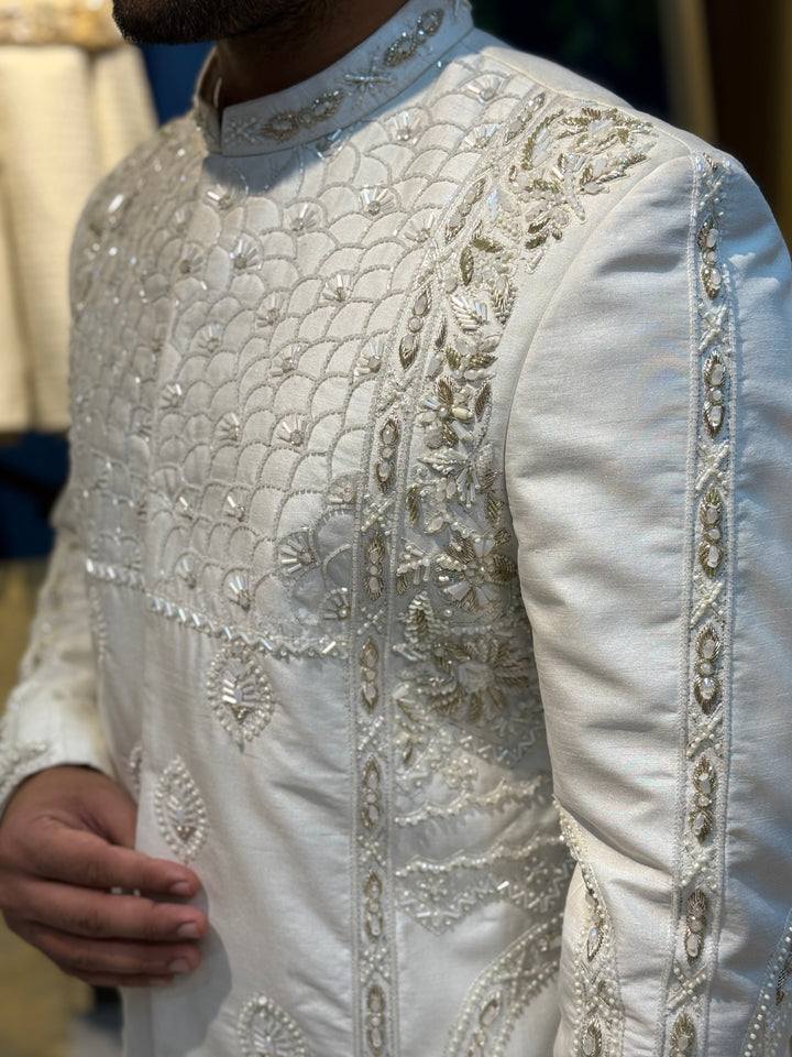WHITE KOREAN RAW SILK SHERWANI - ONLY SHERWANI